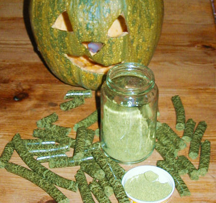 Kürbiskernpreßkuchen bestreut, das wunderhübsche Grün hat leider die
